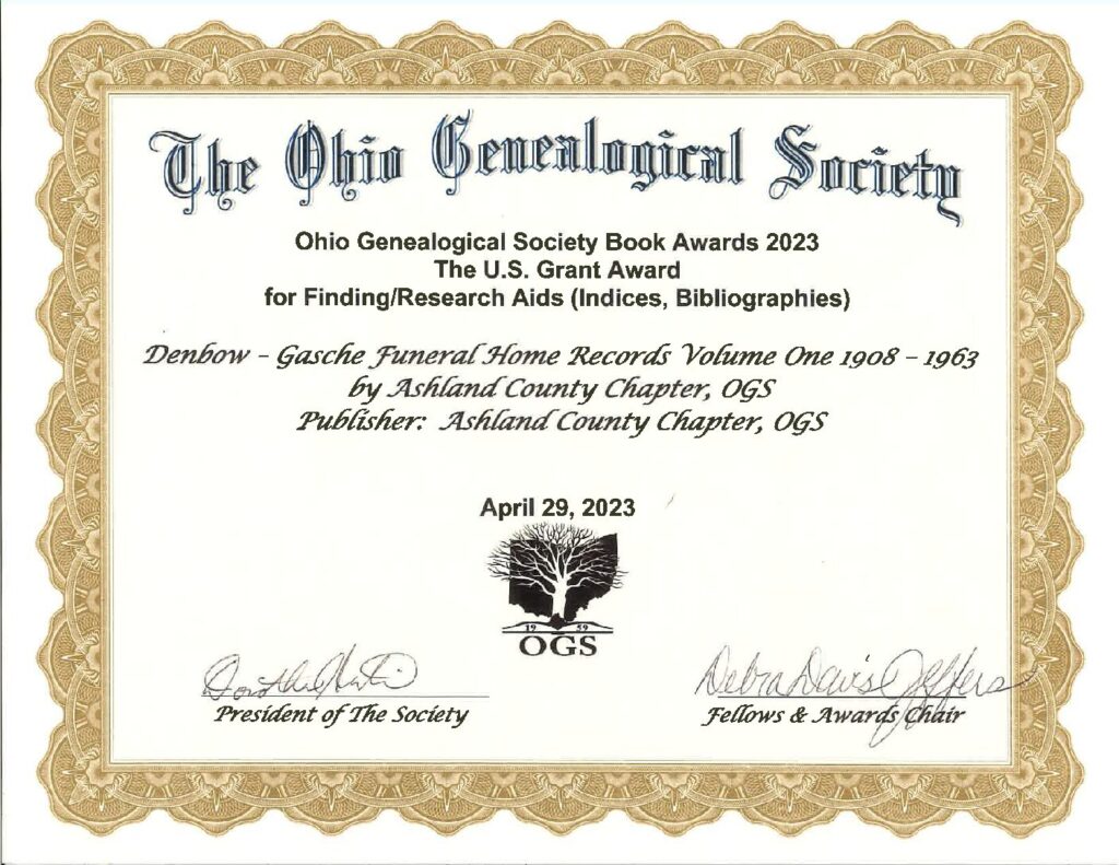 This is a complete alphabetical index of all funerals handled by what is now the Denbow-Gasche funeral homes in Ashland, Ohio, between the years of 1908-1963. The book was judged on the following: